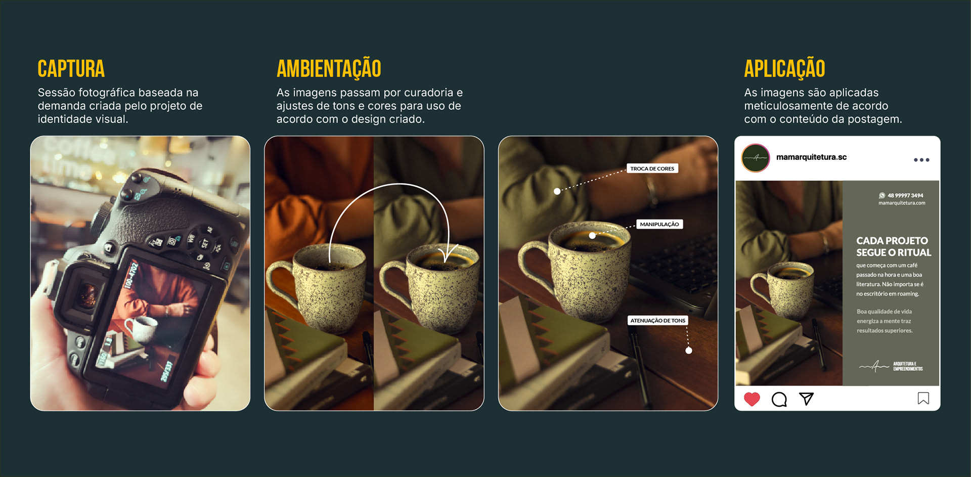 Fazem parte do meu escopo de serviços. Durante o processo de criação da identidade visual eu sempre procuro identificar qual tipo de imagem comunica melhor sobre a marca e com base nisso, tanto a fotografia quanto a linha editorial vai seguir essa lógica.